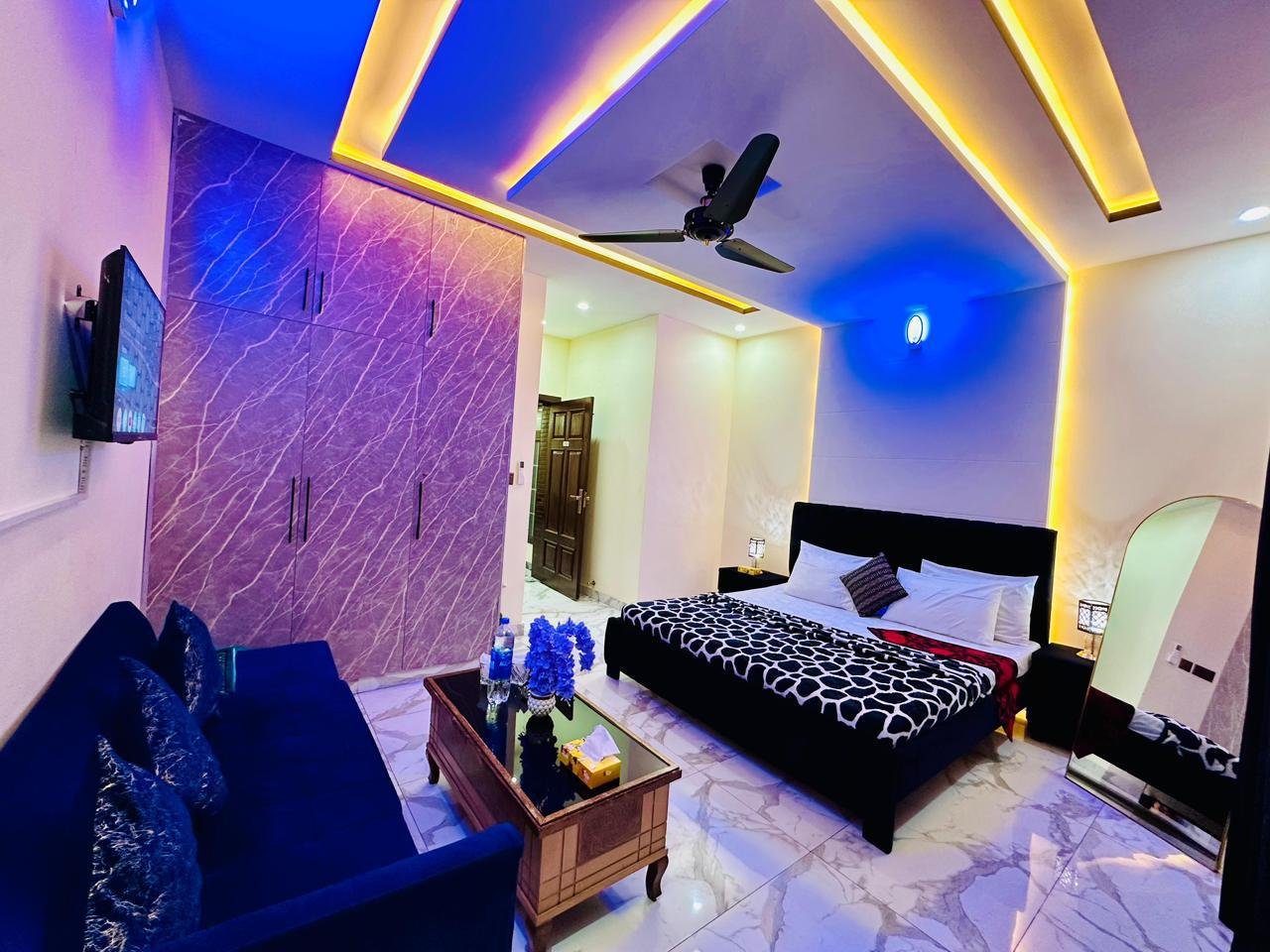 Our Gold Suite Room offers a stunning blend of modern luxury and bold design. Featuring a signature navy blue geometric wall with gold accents, this suite is enhanced by elegant LED lighting, premium marble floors, and plush furnishings. It is the perfect sanctuary for guests seeking a sophisticated and high-end stay experience.